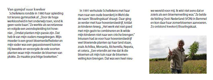 1993 Liesbeth Schellekens richt kwekerij Bisselingskaat op, een bloemenkwekerij waar ze onbespoten bloemen teelt volgens de richtlijnen van de biologische landbouw. De kwekerij start in 1993 als ‘losse zender’ op toenmalige bloemenveiling VON in Bemmel. Alle geoogste bloemen van de kwekerij worden verkocht via de veilingklok van Veiling Oost Nederland aan bloemisten en groothandelaren.