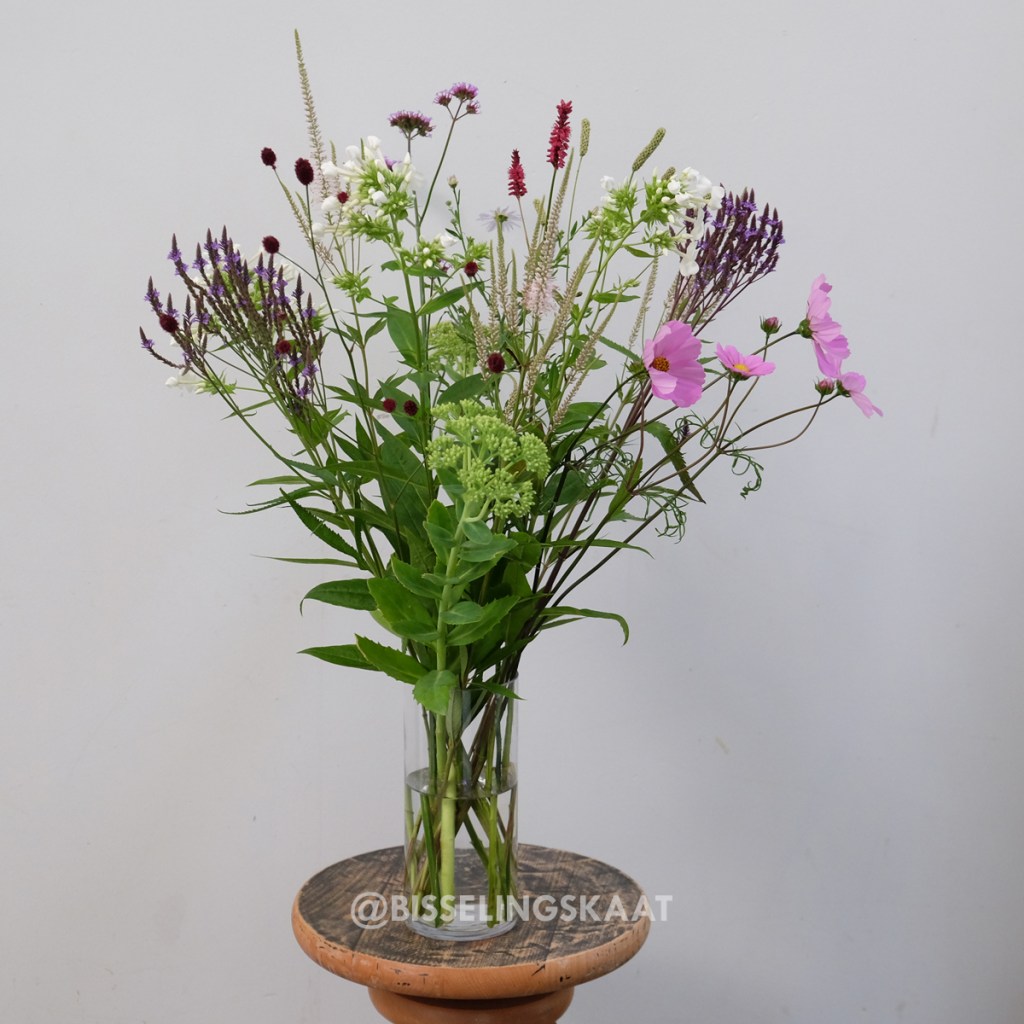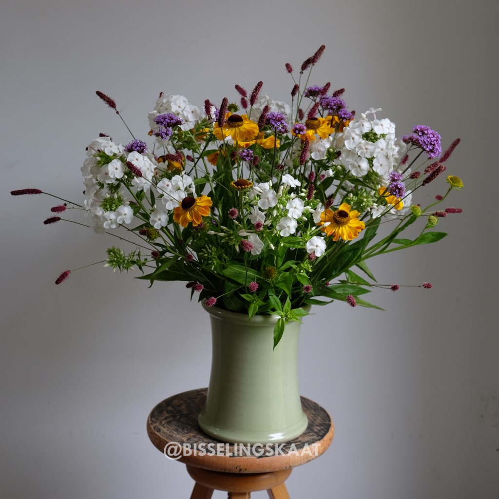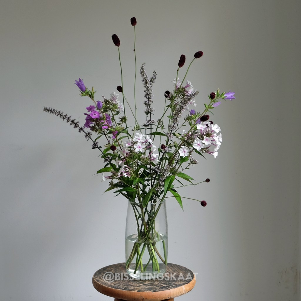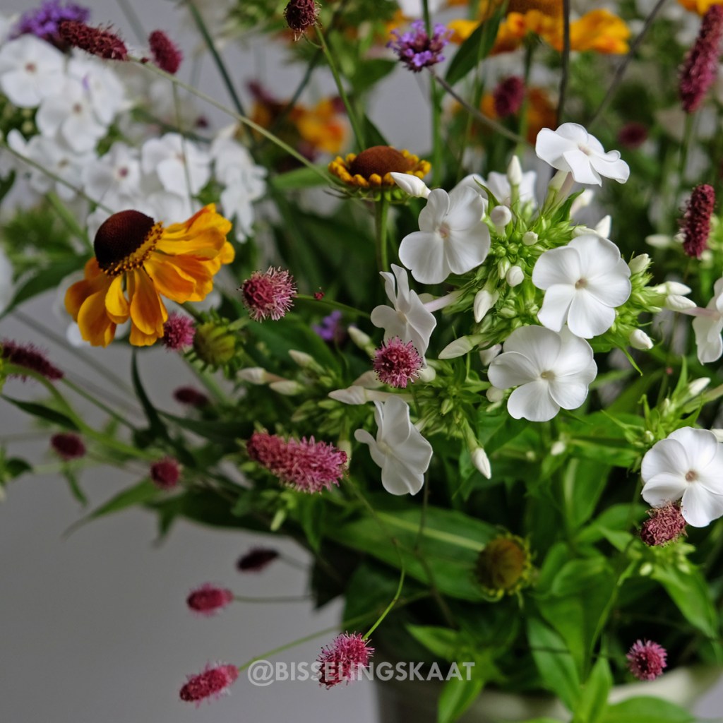 Bloemen in de boeketten van deze week: geel zonnekruid (Helenium), witte & roze vlambloem (Phlox), paars ijzerhard (Verbena), donkerrood, donkerroze & lichtgroene pimpernel (Sanguisorba), lichtblauw kattenkruid (Nepeta), blauw klokje (Campanula), wijnrood prachtriet (Miscanthus)