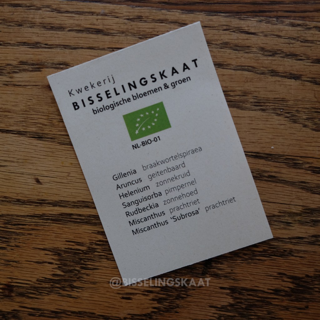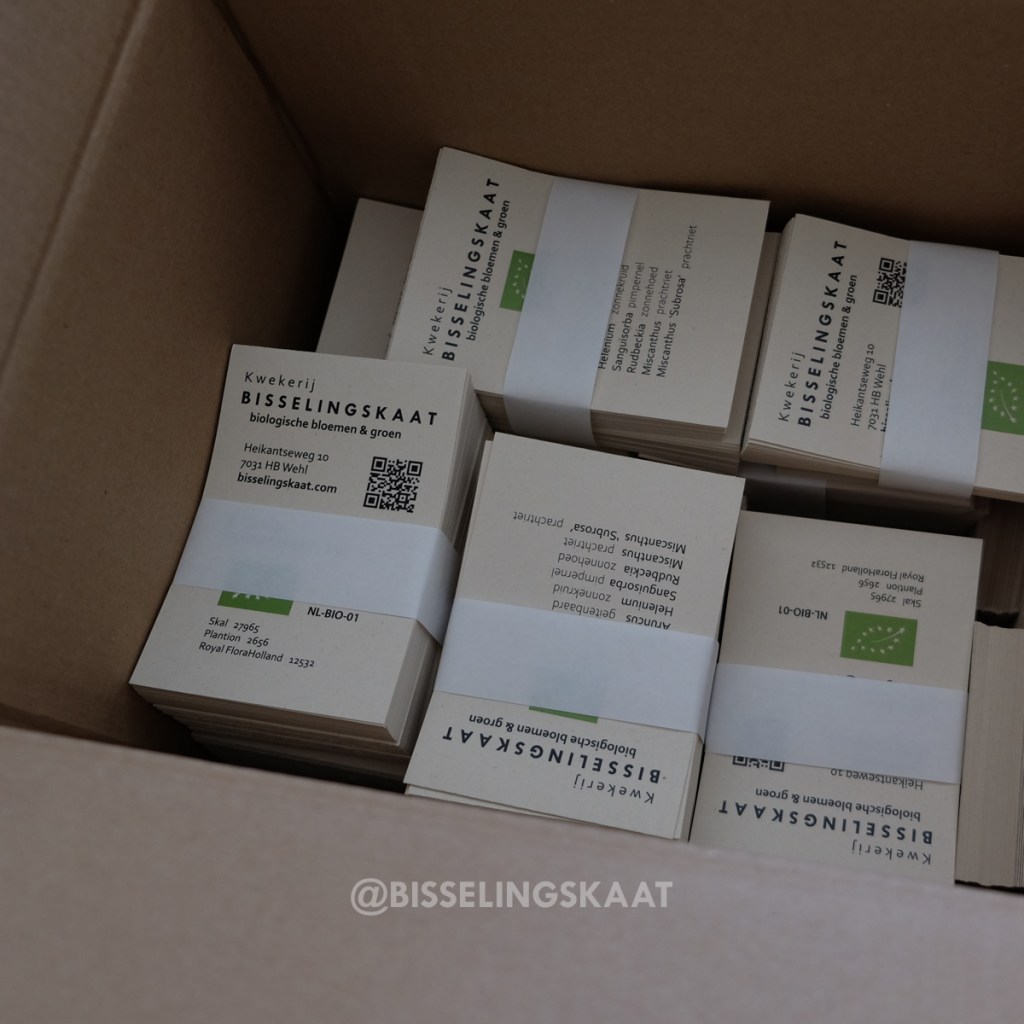 Deze week de allerlaatste gele Helenium geoogst. Zaailingen van Verbena die verspreid over de kwekerij opkomen, opgenomen en bij elkaar in rijen gepoot op het achterland. Zaaibed met zonnebloem, lupine en duizendknoop geschoffeld en gewied. Paden zijn weer zichtbaar, jonge plantjes krijgen weer lucht en licht. Ik ben heel blij met de vers gedrukte fustkaartjes die ik deze week ontving. Het drukwerk is prima verzorgd door Preduxion in Doetinchem. Gebruikte papiersoort is PaperWise. Eigen ontwerp.