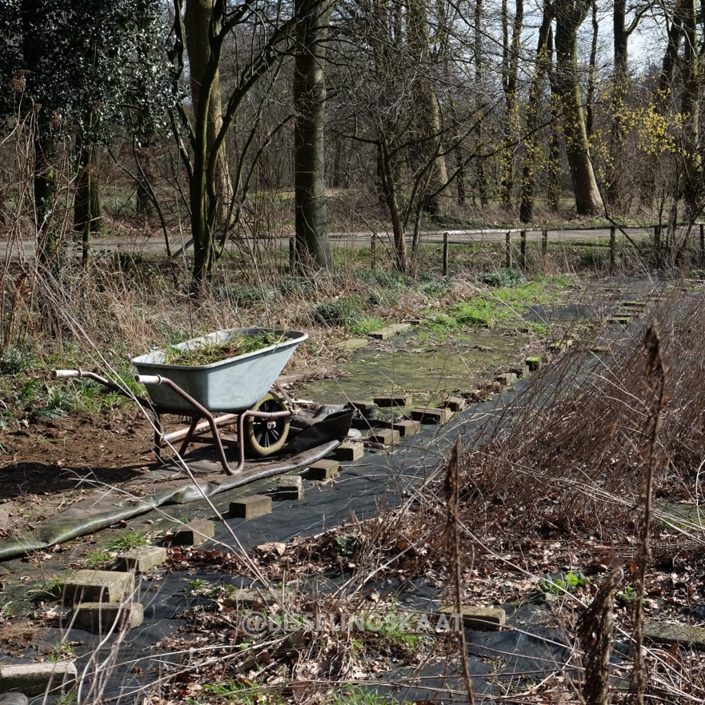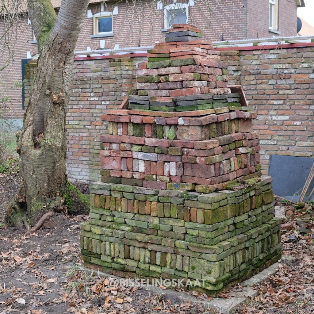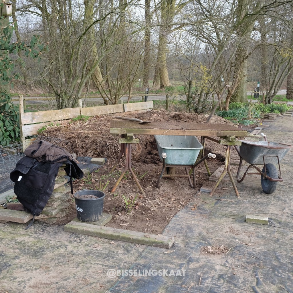 Eindelijk! de laatste dagen van deze week volop zon! Piramide van gebruikte metselstenen & estrikken af. Houtstrook langs erfgrens klaar. Verdergegaan met het onderhoud van de houtstrook langs de weg. Parrotia persica (ijzerhout) gesnoeid, veel brandnetel en gras weggehaald. Afdekgronddoek verwijderd van composthoop. Rafelranden van dit gronddoek met heteluchtpistool dichtgeschroeid. Rozenstruiken in houtstrook gesnoeid.