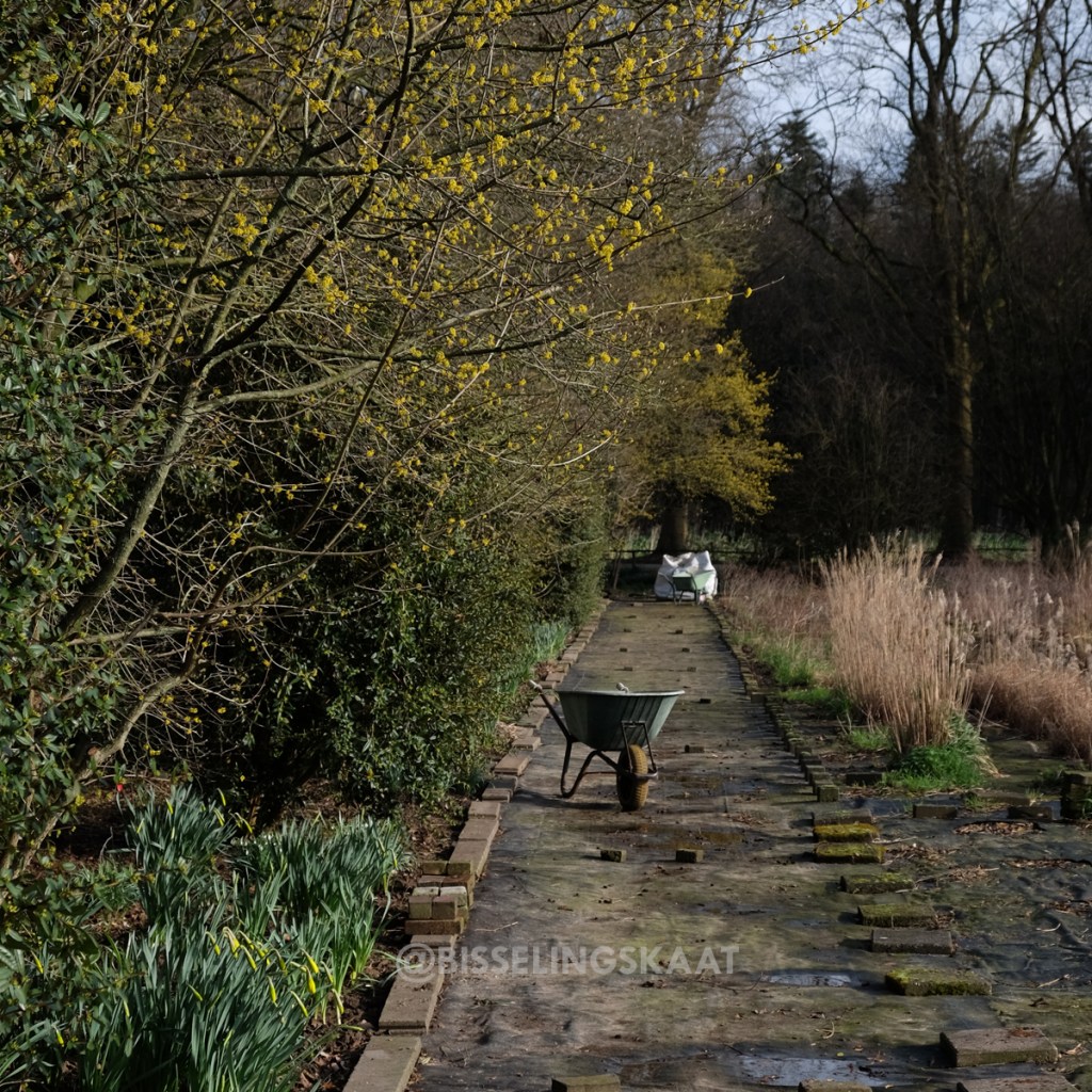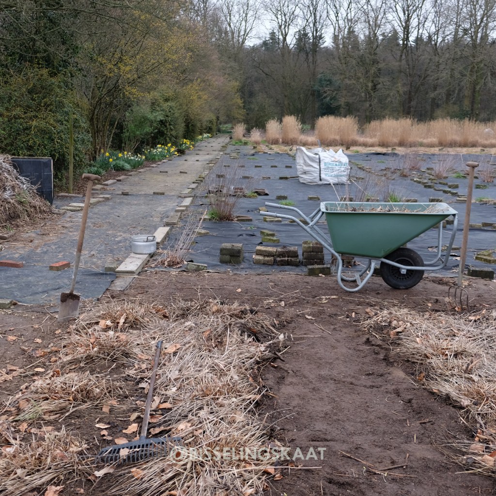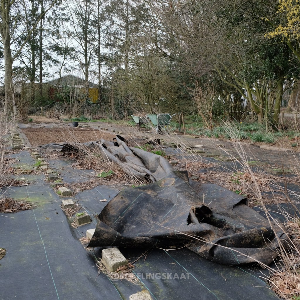 Eindelijk! de laatste dagen van deze week volop zon! Piramide van gebruikte metselstenen & estrikken af. Houtstrook langs erfgrens klaar. Verdergegaan met het onderhoud van de houtstrook langs de weg. Parrotia persica (ijzerhout) gesnoeid, veel brandnetel en gras weggehaald. Afdekgronddoek verwijderd van composthoop. Rafelranden van dit gronddoek met heteluchtpistool dichtgeschroeid. Rozenstruiken in houtstrook gesnoeid.
