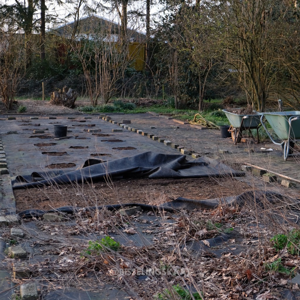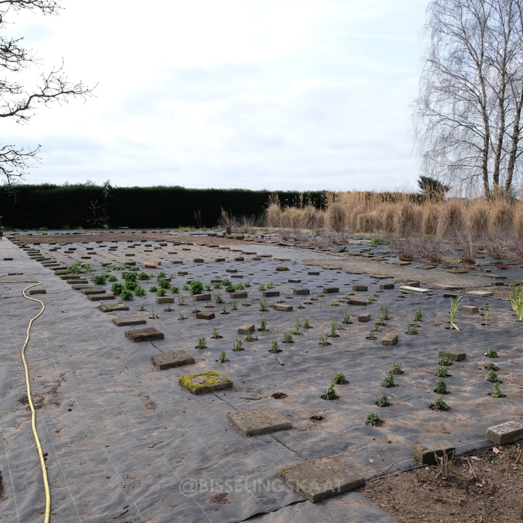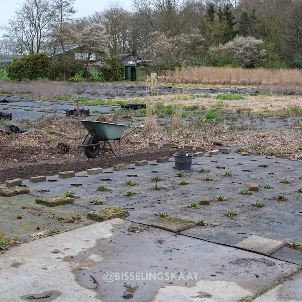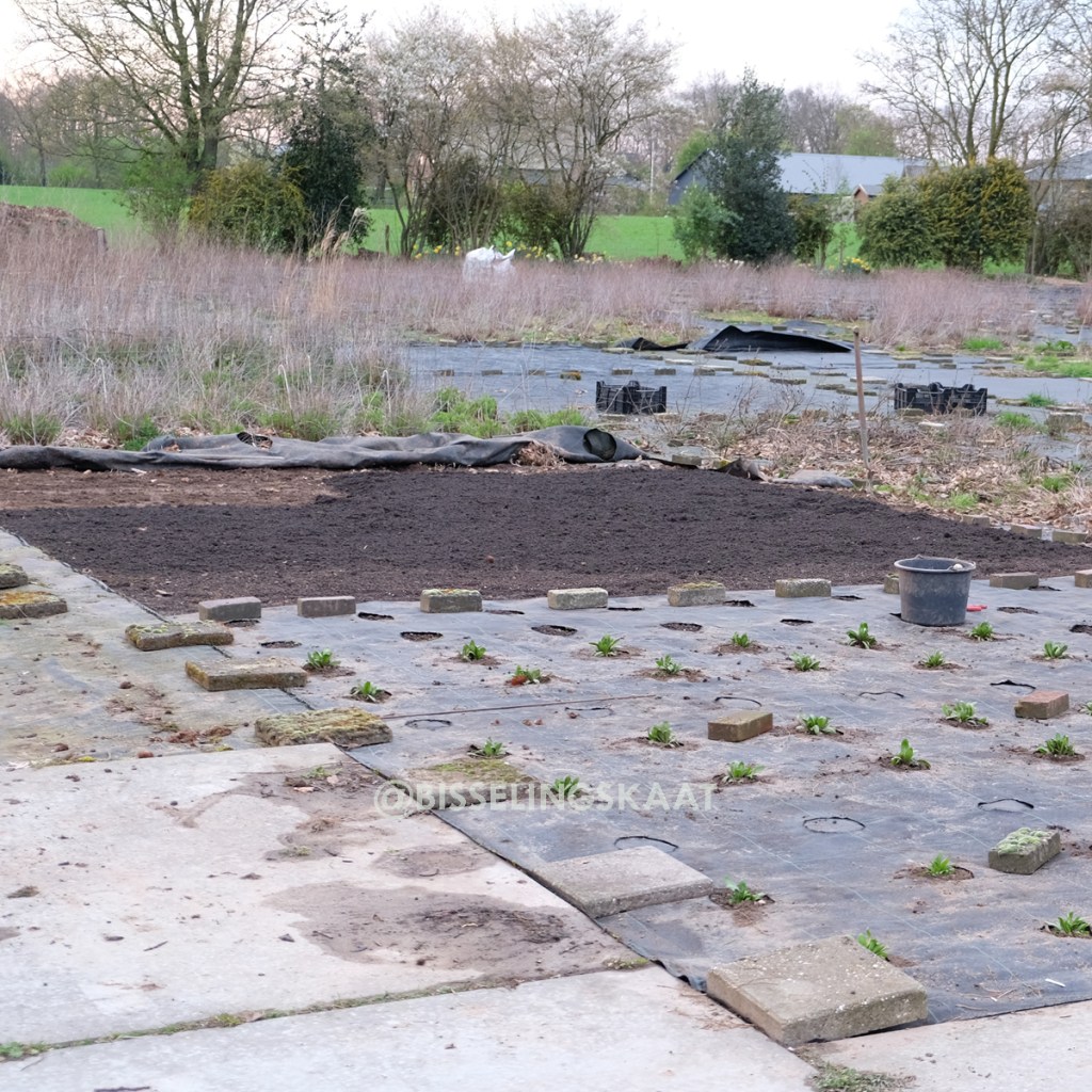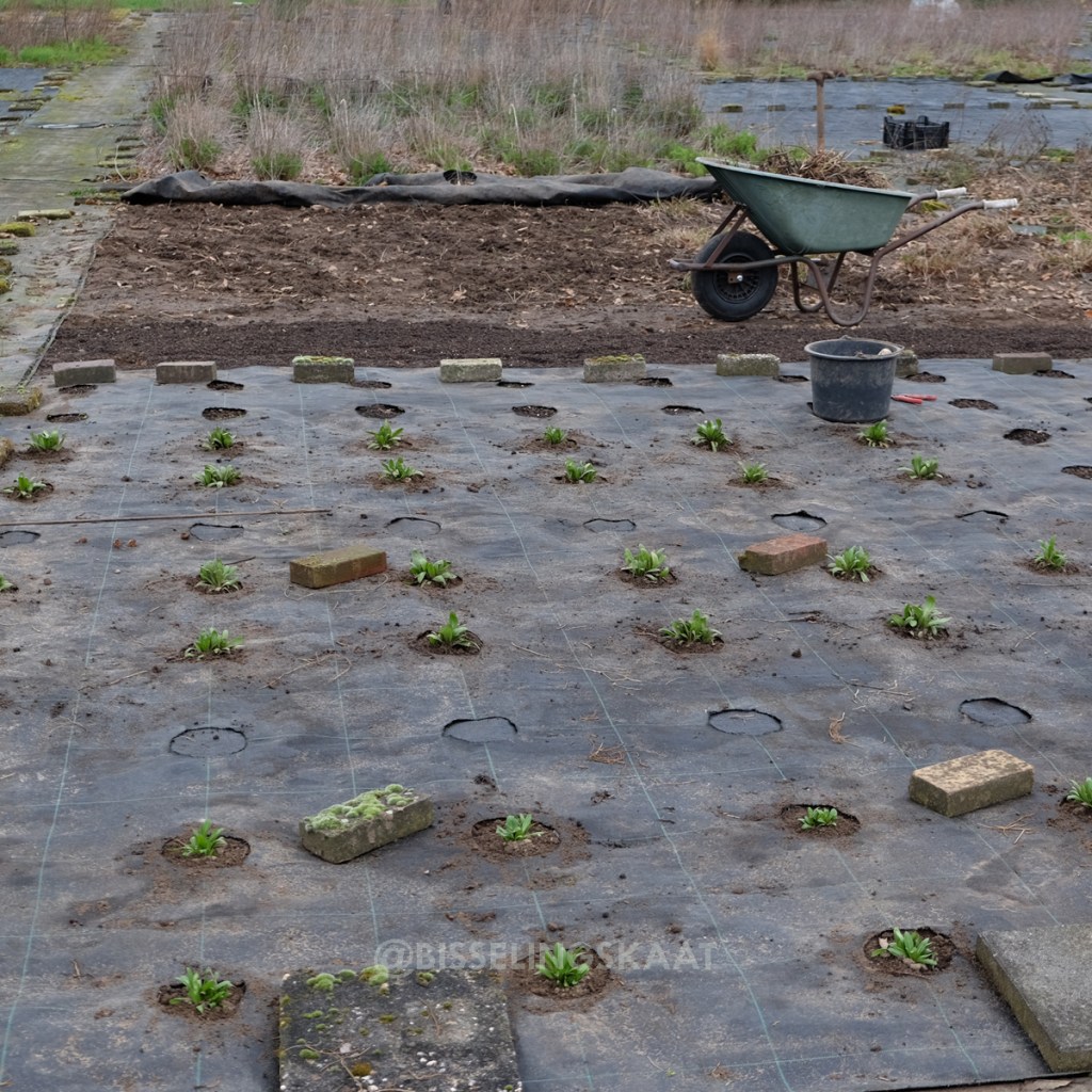 Het plukveld aangevuld met pimpernel (Sanguisorba), ijzerkruid (Vernonia), zonneoog (Heliopsis). Spontane zaailingen van prachtriet (Miscanthus) gesplitst in twee. Deze uitgeplant in apart, eigen veld op het achterland. Keurcompost verspreid. Biokippenmest gemengd met kieseriet gestrooid op eerste veld in vak 8B waar geel zonnekruid (Helenium) wordt gepoot. Donkerrode Sanguisorba gerooid. De grond is verzadigd met water wat het rooien moeizaam maakt. Het noodzakelijk rooien van miscanthus is daardoor onbegonnen werk. Dit moet uitgesteld worden. Gele Helenium opgenomen, gesplitst en gepoot op 2 nieuwe velden in vak 8B. In vak 9 het gronddoek verwijderd, de grond geëgaliseerd en keurcompost en biokippenmest / kieseriet verspreid. Helenium gepoot op 2 velden in vak 8B en 1 veld in vak 9. Compost en biokippenmest / kieseriet verspreid tussen witte Sanguisorba wit. Om de Sanguisorba-planten ronde steunen van schapengaas geplaatst.